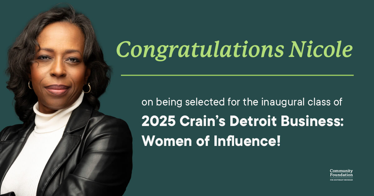 Crain’s Detroit Business recently honored Community Foundation for Southeast Michigan President and CEO Nicole Sherard-Freeman among its inaugural class of Women of Influence.