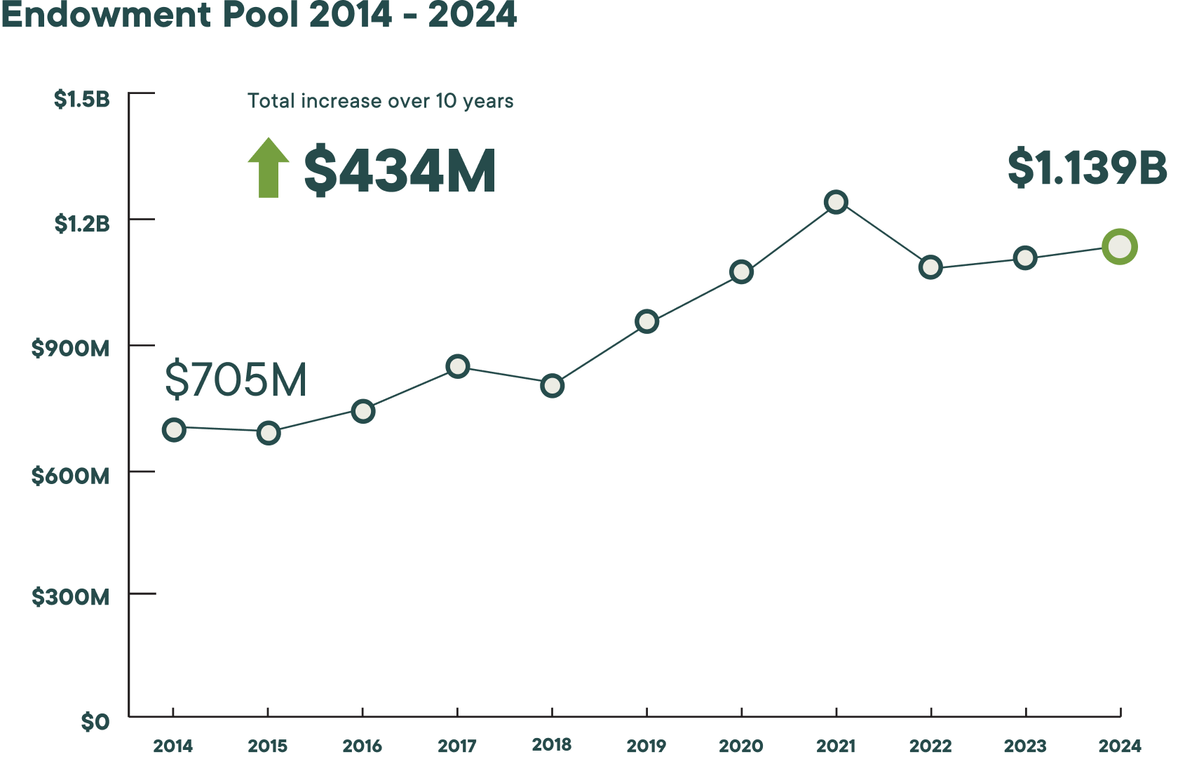 The endowment pool is managed with a long-term perspective where principal is preserved and enhanced over time. The primary goal is total return, which is consistent with prudent investment management.